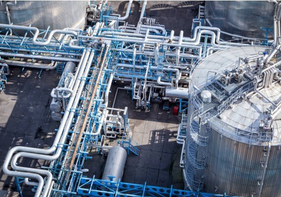 "oil refinery chimneys, breathtaking views are lost in the deep blue sky."